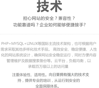 首屈一指的技术团队,HTML5等最新技术的运用,创造全新的高品质浏览感受;PHP+MYSQL+APACHE+LINUX等国际主流技术架构。